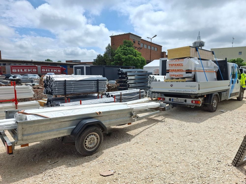 Csakhogy ma már van egy kiskapu, mert oda is kell konténer, ahová a daru nem jut el. A lapraszerelt konténer nem egyben érkezik, hanem elemekre bontva.
